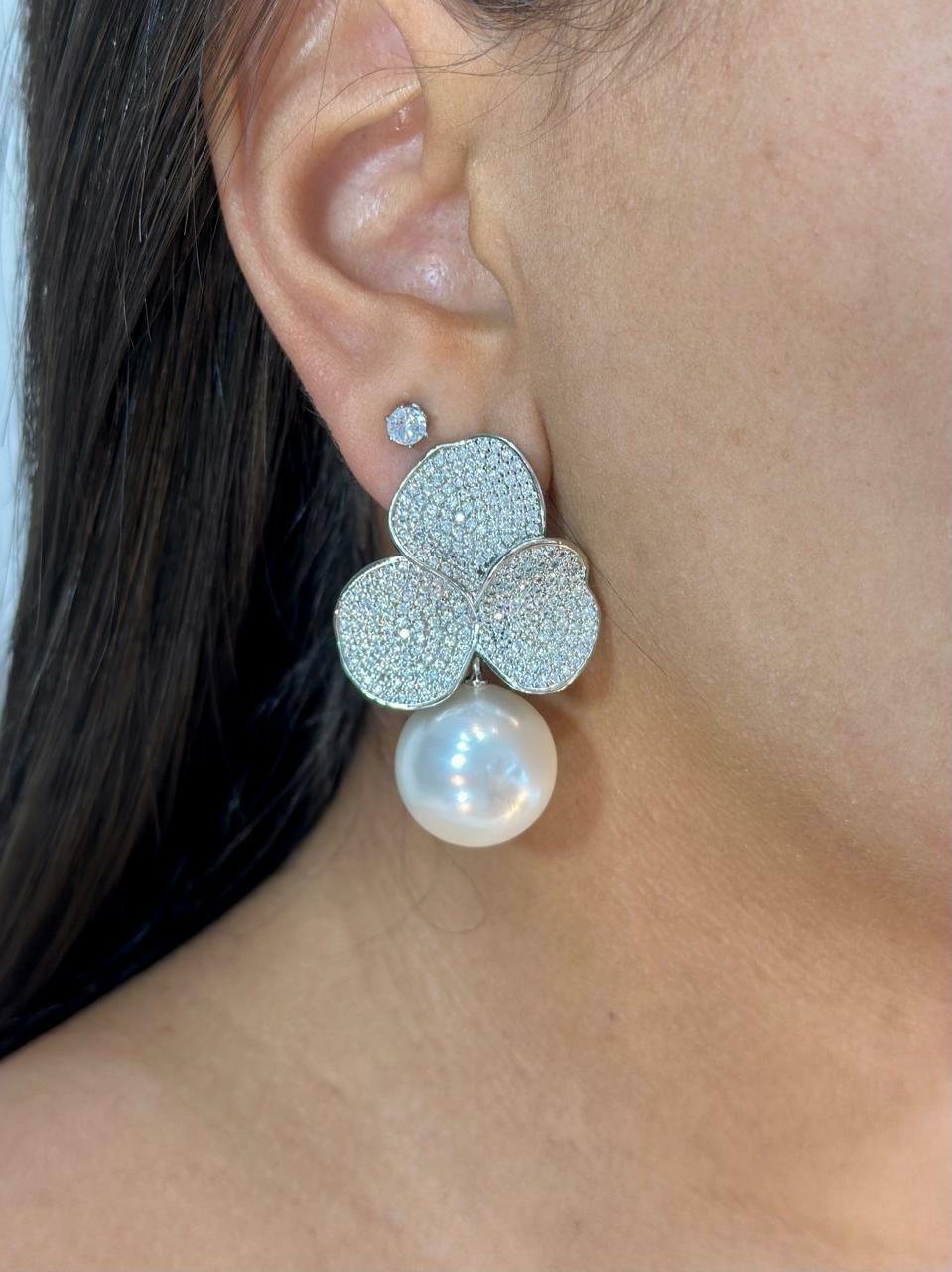 Brinco de Festa Flor com Pérola e Pedrarias em Zircônia